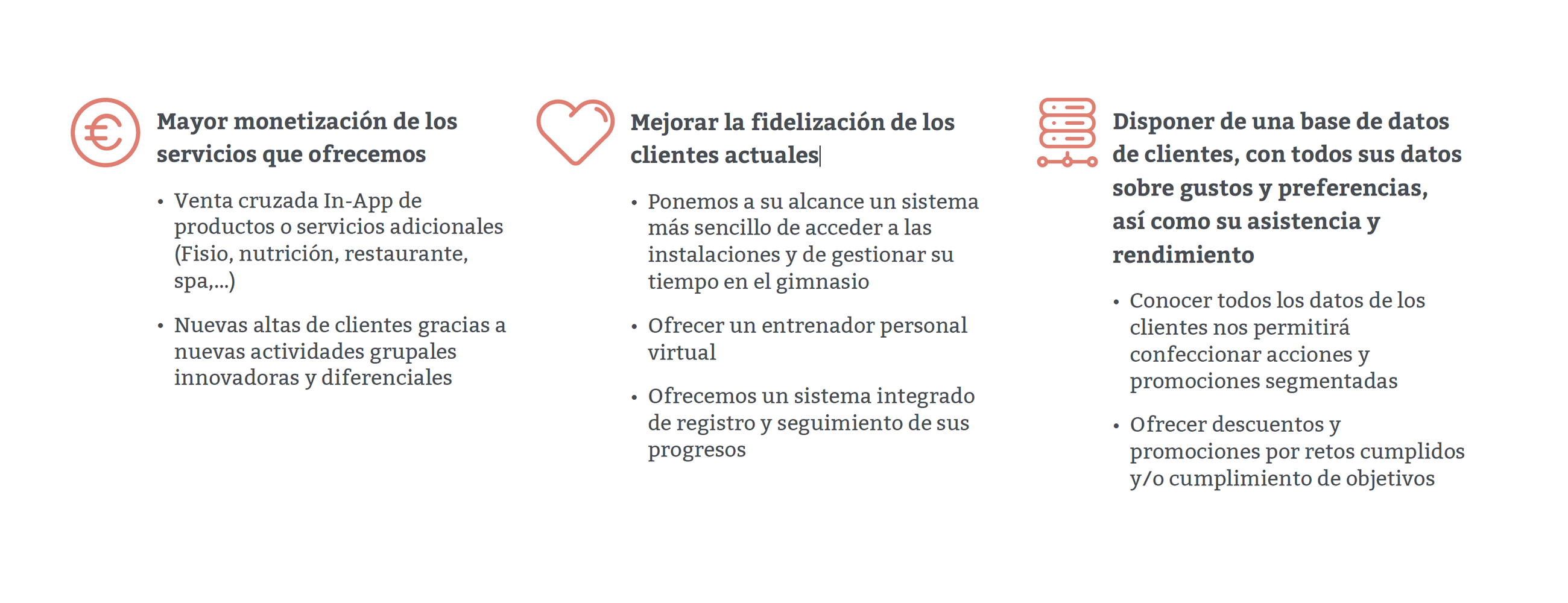 Alertas de sus clases programadas, consejos y recomendaciones sobre su nutrición, recomendaciones de actividades relacionadas con sus gustos e intereses, registro de actividad en cada sesión de entrenamiento, monitorización de mis logros, premios y descuentos por cumplimiento de objetivos, retar a otros usuario, etc